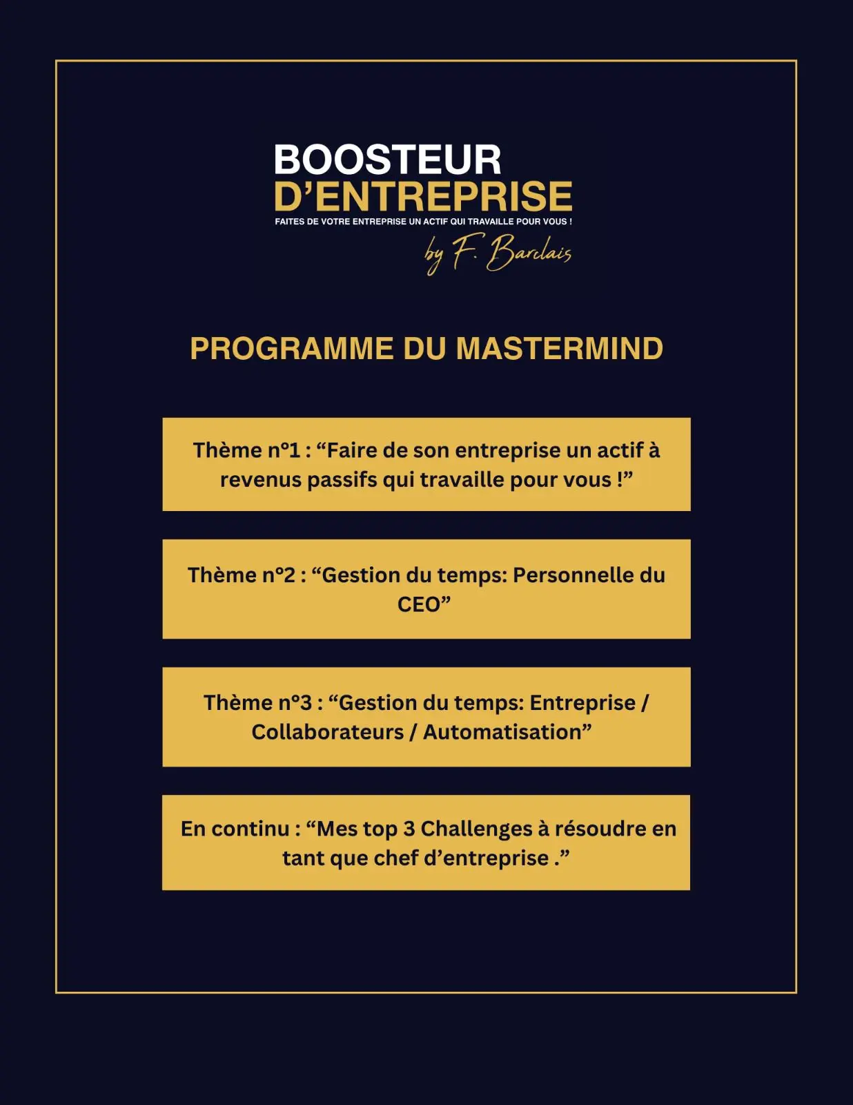 - Thème N°1 : "Faire de son entreprise un actif à revenus passifs qui travaille pour vous !"
